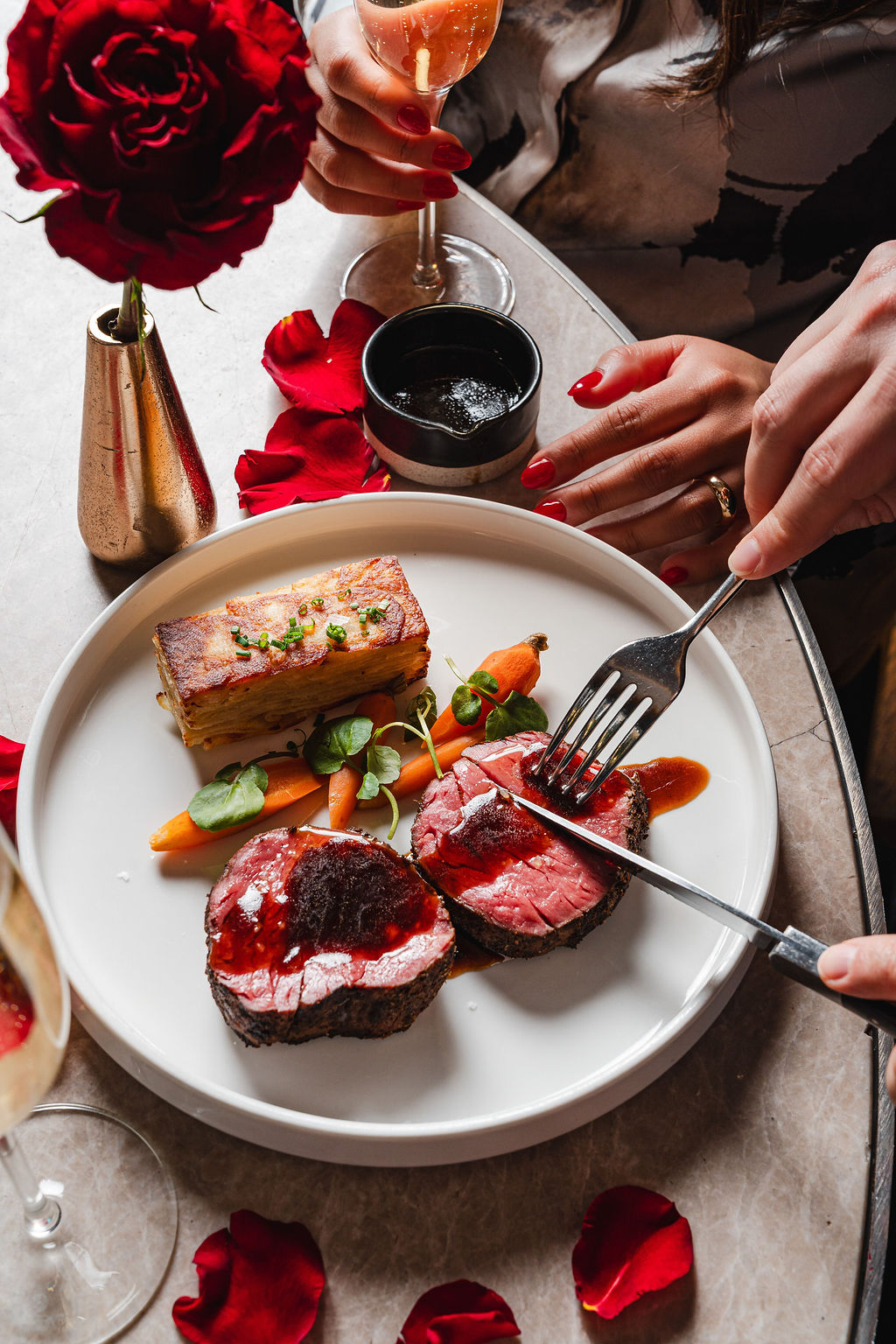 From February 13 to 15, LOUIX LOUIS hosts a five-course Valentine’s Day dinner that feels deliberately indulgent. Highlights include caviar beignets, seared diver scallops, and classic showstoppers like steak and lobster or whole Dover sole meunière. The grand, shimmering space adds a cinematic quality to the evening, turning dinner into a memory rather than a reservation.